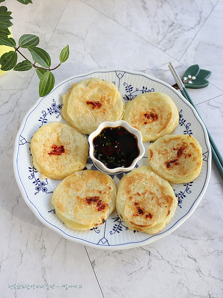 잘 부쳐진 무전을 접시에 보기 좋게 담아냅니다. 곁들임으로 초간장을 준비하면 더욱 맛있게 즐길 수 있어요. 취향에 따라 간장, 식초, 고춧가루, 다진 마늘, 참깨를 섞어 만들어보세요.