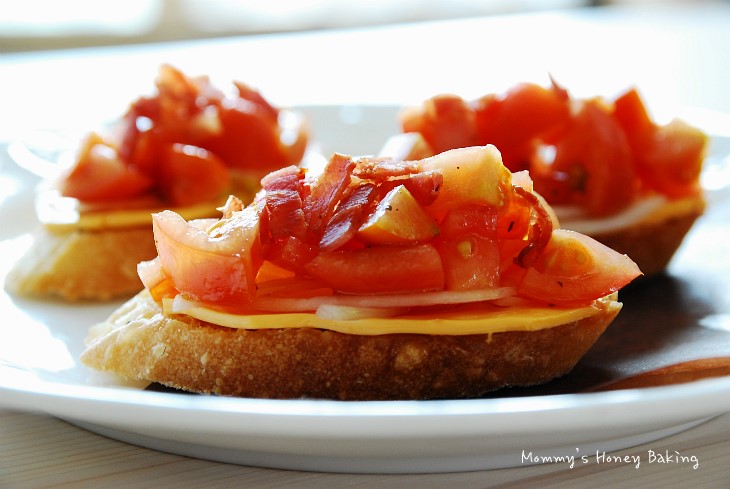 마지막으로 1번에서 준비해둔 올리브 오일과 발사믹 식초로 버무린 방울토마토를 치즈와 양파 위에 보기 좋게 얹어주고, 그 위에 바삭하게 만든 베이컨 칩을 골고루 뿌려주면 맛있는 오픈 샌드위치 완성입니다! 따뜻할 때 바로 드시면 더욱 맛있습니다.
