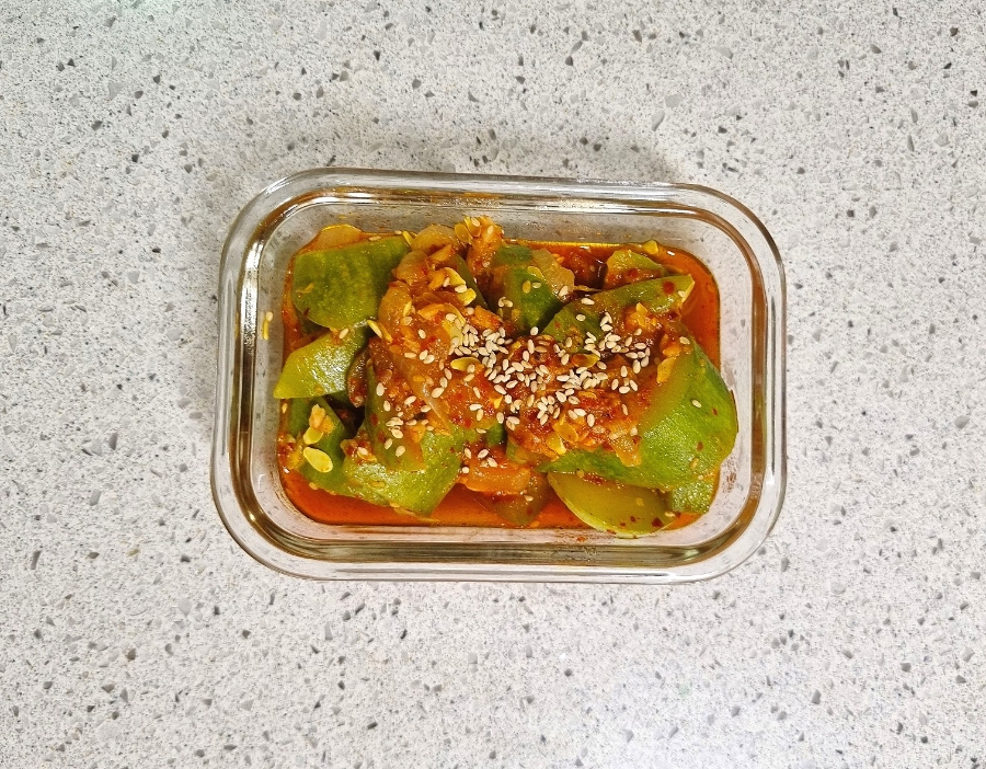 마지막으로 통깨를 솔솔 뿌려주면 맛있는 새우젓 애호박볶음 완성입니다! 따끈한 밥 위에 올려 덮밥으로 즐기거나, 다른 반찬과 함께 곁들여 보세요. 남은 음식은 밀폐 용기에 담아 냉장 보관해주세요.