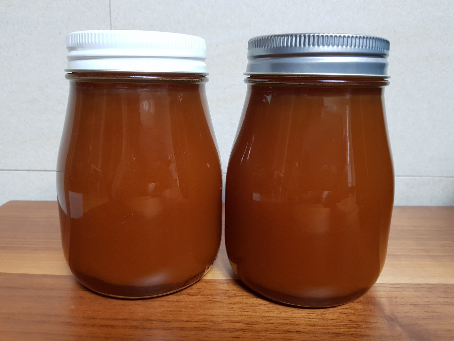 총 2.5kg의 손질된 생강, 1kg의 설탕, 500g의 조청, 그리고 800ml의 배즙을 사용하여 완성된 생강청은 약 2.4L 정도의 양이 나왔습니다. 재료의 양에 따라 결과물의 양은 달라질 수 있습니다.