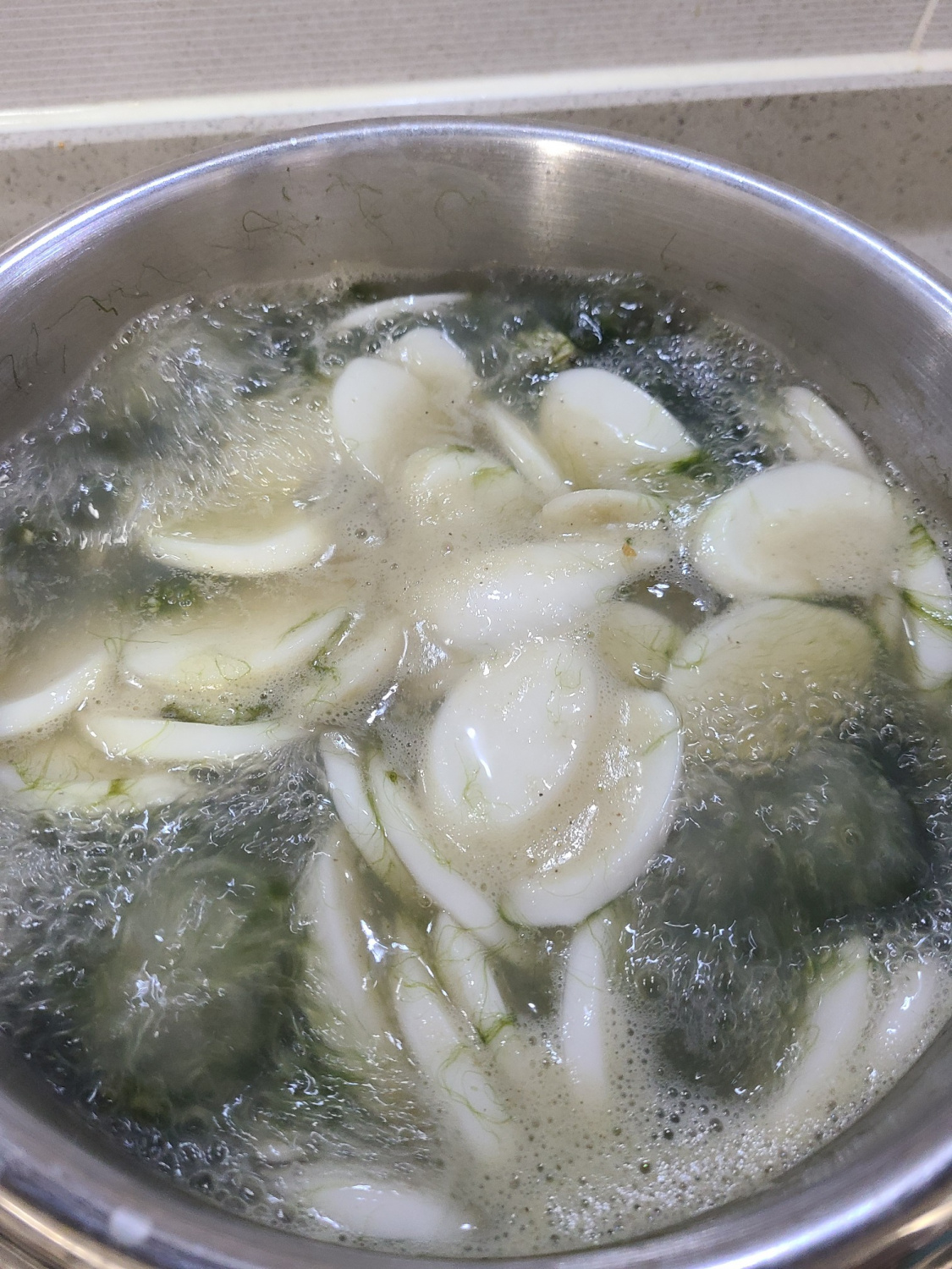떡이 익기 시작하면 준비해둔 생굴과 매생이를 넣습니다. 이때, 굴과 매생이를 넣은 후에는 센 불보다는 중약불에서 끓여주세요. 매생이를 넣은 뒤에는 너무 오래 끓이면 식감이 질겨지고 맛이 흐려질 수 있으니, 떡을 넣은 시점부터 약 5분 내외로만 끓여주는 것이 좋습니다. 굴이 익고 매생이가 부드럽게 풀어지면 됩니다. 비린 맛이 신경 쓰인다면 이때 식초를 아주 살짝만 (한두 방울 정도) 넣어주면 국물이 훨씬 깔끔해집니다.