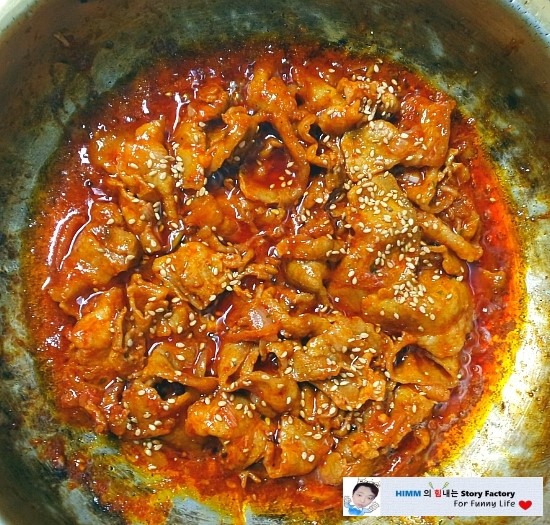 돼지고기 표면이 노릇하게 익으면 만들어둔 양념장을 팬에 붓고 함께 볶아줍니다. 양념이 고기와 채소에 골고루 배도록 잘 섞어주세요. 양념 색이 고기에 예쁘게 입혀지면 불을 약하게 줄이고, 양념이 타지 않도록 주의하며 천천히 조리듯 익힙니다. 모든 재료가 충분히 익고 양념이 자작하게 졸아들면 불을 끄고, 취향에 따라 깨소금을 솔솔 뿌려 마무리합니다. 뜨거울 때 밥과 함께 맛있게 드세요!