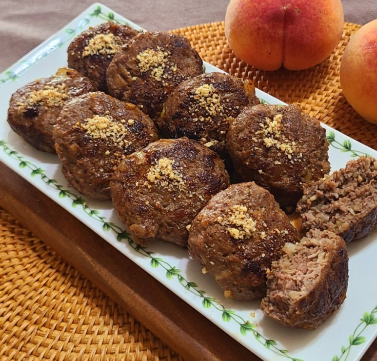 이렇게 완성된 떡갈비는 속은 촉촉하고 부드러우며, 겉은 은은하게 구워져 정말 맛있어요. 달지 않고 고소한 맛이 일품이니 꼭 한번 만들어 보세요!