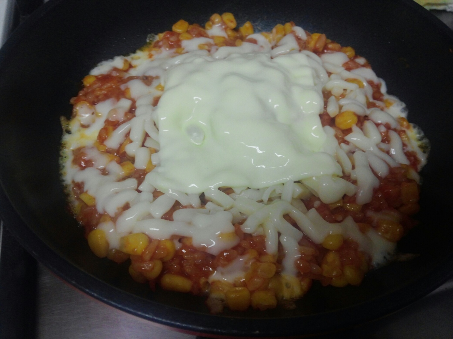 이제 뚜껑을 덮고 중약불에서 천천히 치즈를 녹여줄 거예요. 불이 너무 세면 밥이 탈 수 있으니 꼭 불 조절에 신경 써주세요. 인내심을 가지고 기다리면 맛있는 치즈 냄새가 솔솔 올라올 거예요.
