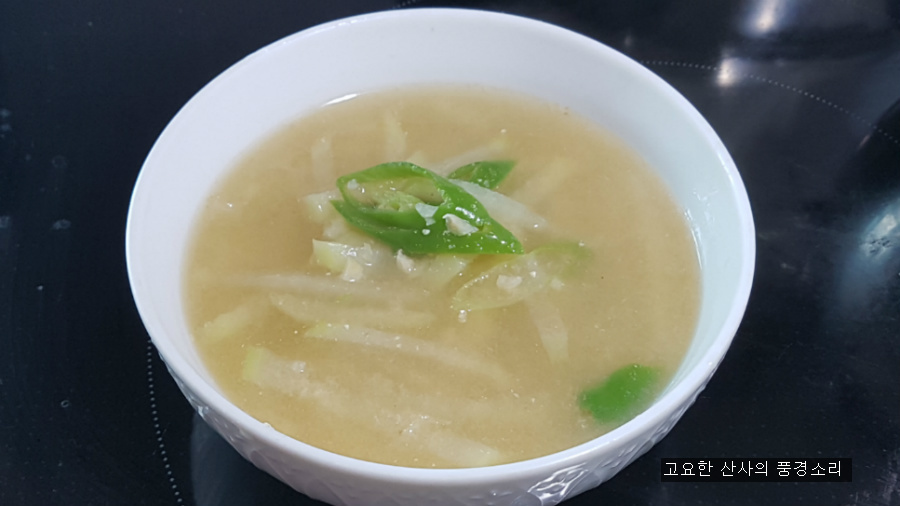 먼저 냄비에 준비한 육수 5컵을 붓고 1분간 팔팔 끓여주세요. 육수가 끓으면 다시 팩이나 건더기를 모두 건져내 깨끗한 육수만 남겨주세요. 그런 다음 얇게 채 썰어 준비한 무를 냄비에 넣고 중간 불에서 끓여줍니다.