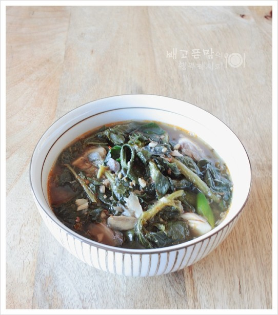 무청 시래지는 가을 무에서 나온 것을 말려두었다가, 사용하기 전에 불리고 삶아서 준비했습니다. 냉동해 두었던 것을 활용해도 좋아요. 삶은 무청 한 줌을 먹기 좋은 크기로 덤성하게 썰어줍니다. (무청 대신 삶은 단배추를 사용해도 맛있습니다.)