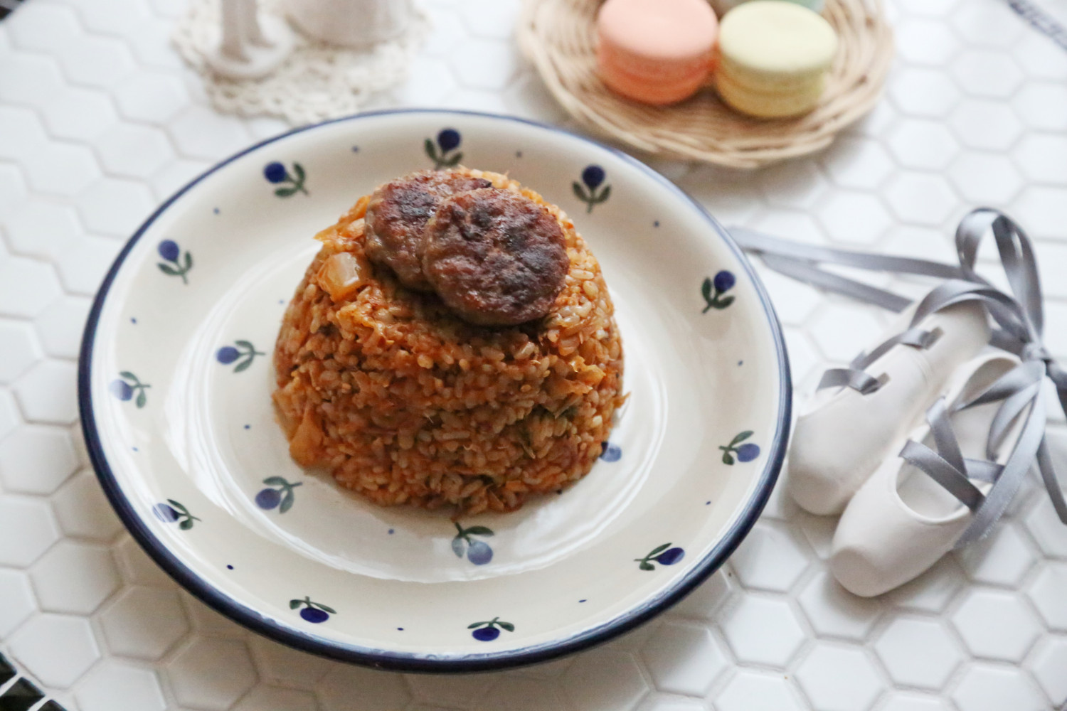 준비한 참치김치볶음밥을 예쁜 그릇에 보기 좋게 담고, 노릇하게 구운 떡갈비를 그 위에 올려주면 근사한 한 끼 식사가 완성됩니다. 맛있게 즐기세요!