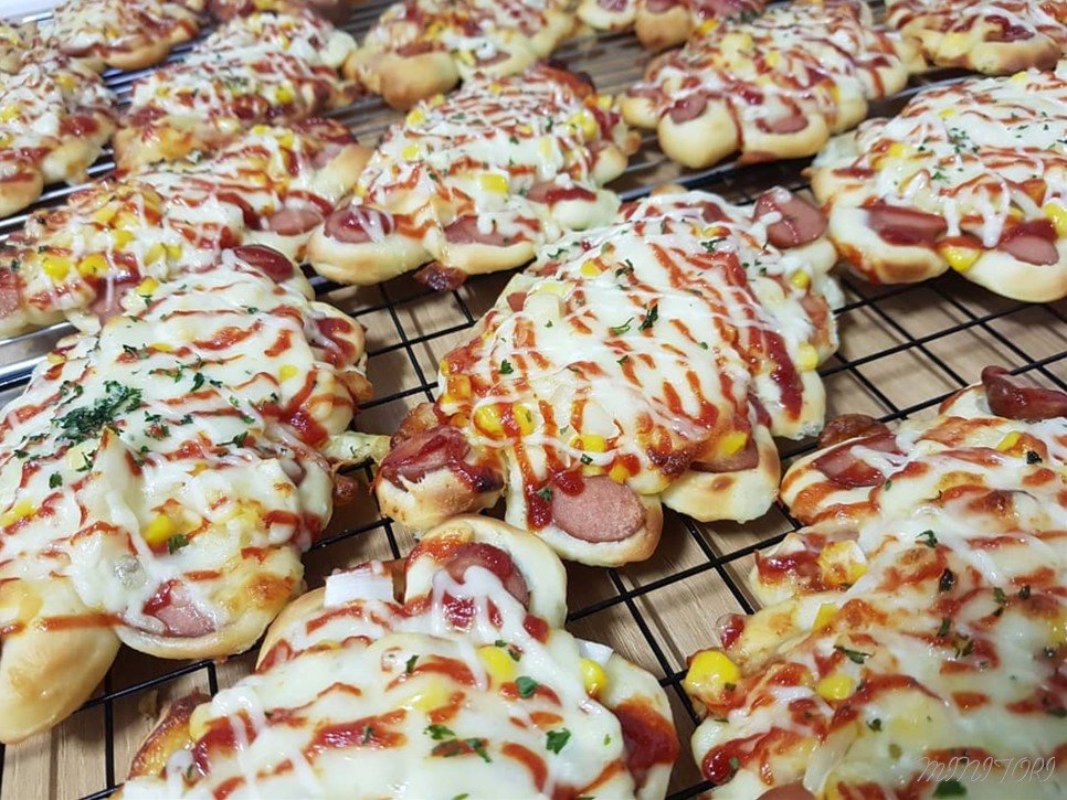 마지막으로 케첩과 마요네즈를 지그재그로 보기 좋게 뿌려주세요. 이 소스들이 피자빵의 풍미를 한층 더 살려주는 중요한 역할을 하니, 듬뿍 뿌려주는 것이 맛있게 즐기는 팁입니다!