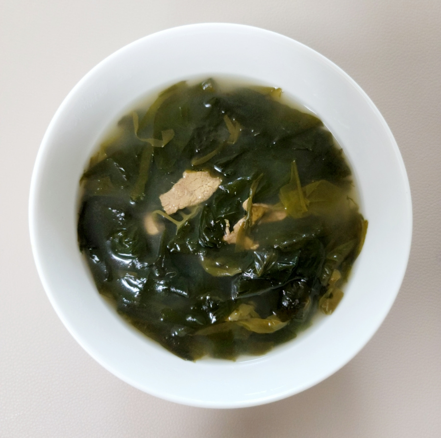 완성 및 서빙: 다시팩에 담았던 마늘을 건져낸 후, 국물이 진하고 깔끔하게 우러난 소고기 미역국을 맛있게 즐겨주세요. (사진상으로는 잘 표현되지 않았지만) 맑으면서도 깊은 맛이 일품입니다. 따뜻한 밥과 함께 드시면 더욱 맛있습니다.