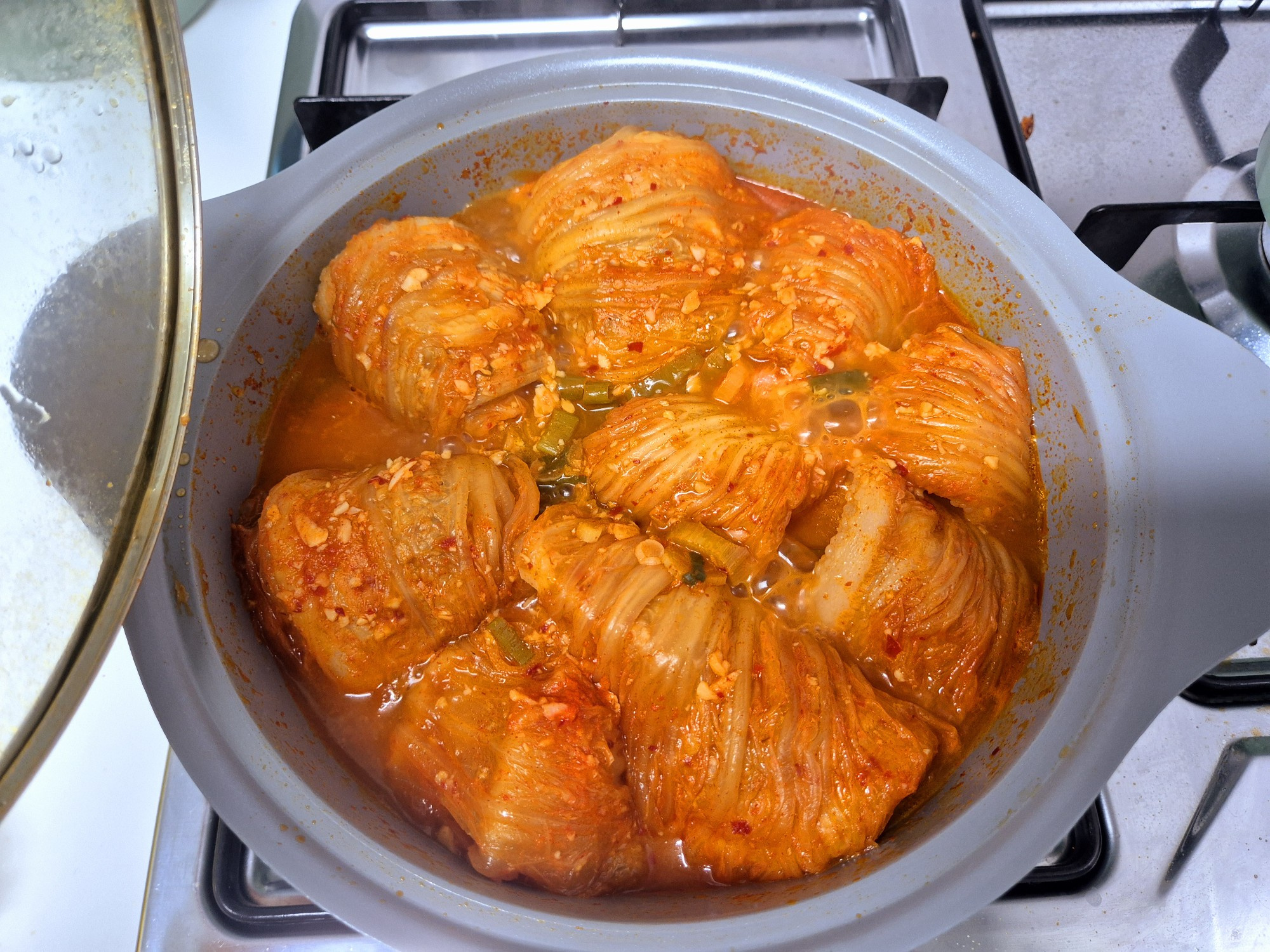 이제 뚜껑을 닫고 중약불에서 20~25분간 푹 끓여주세요. 끓는 동안 국물이 튈 수 있으니 중간중간 뚜껑을 열어 확인하며 국물이 졸아들면 육수를 조금씩 보충해주세요. 이렇게 끓이면 삼겹살은 부드럽고 묵은지는 깊은 맛이 우러나와 환상의 조합을 이룹니다.