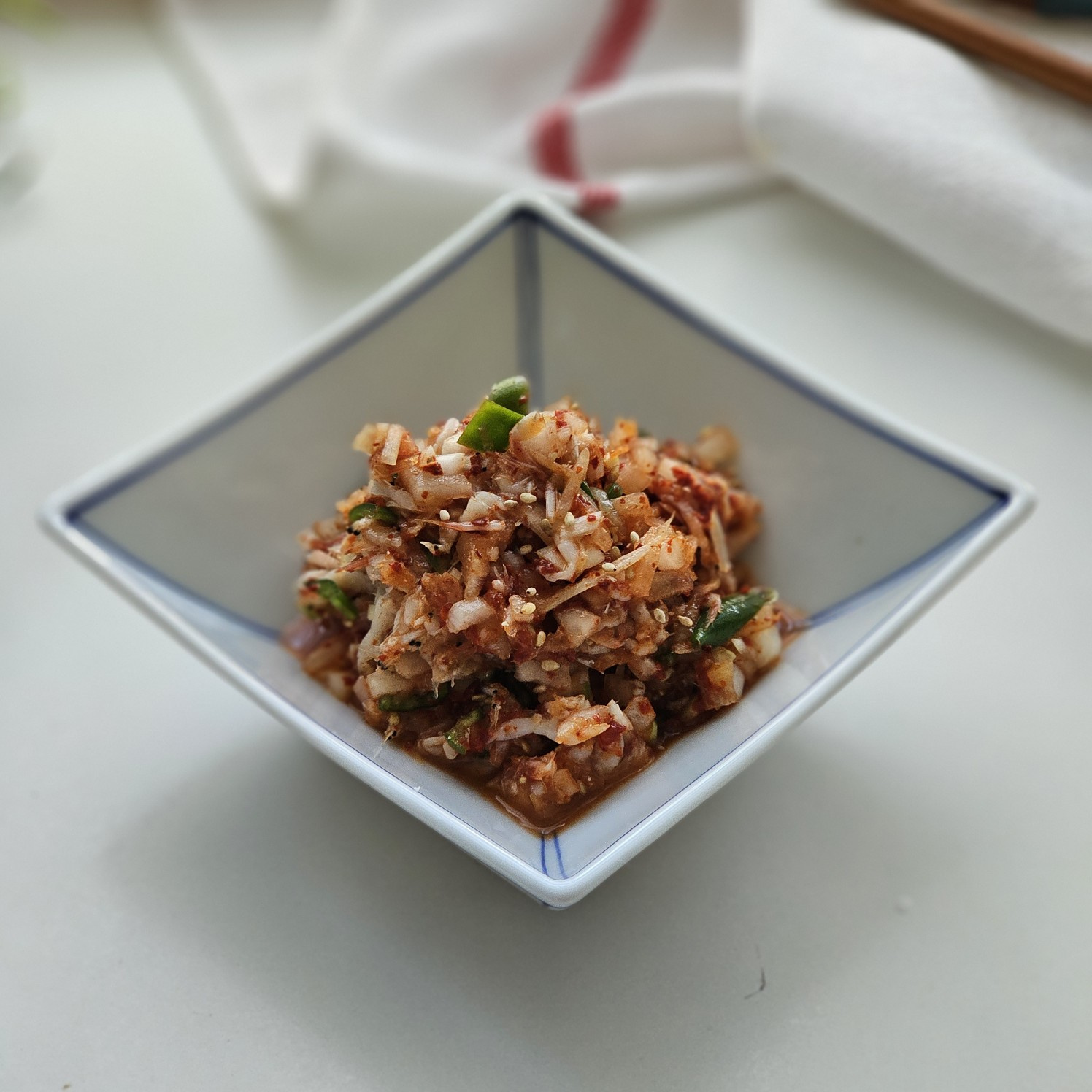 모든 재료와 양념이 어우러지도록 숟가락이나 주걱을 이용해 골고루 버무려주세요. 새우젓이 뭉치지 않고 채소와 양념이 잘 섞이도록 충분히 섞어주는 것이 중요합니다.