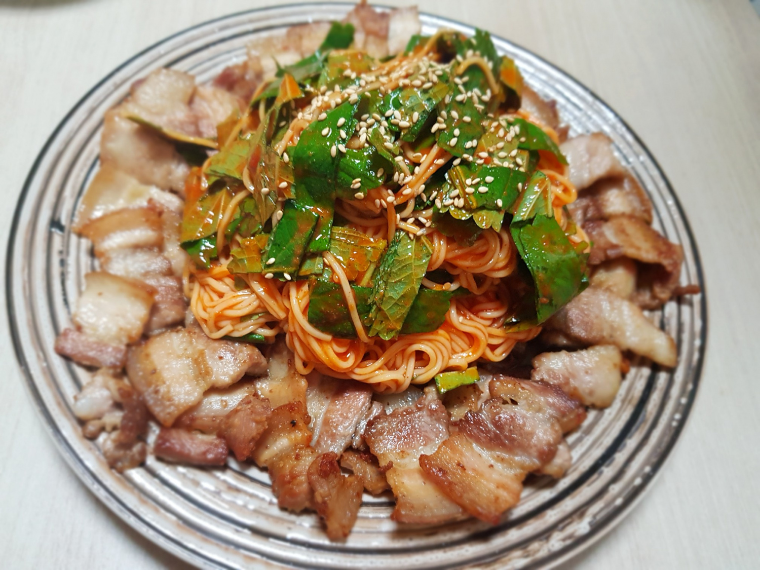 매콤달콤 비빔국수와 고소한 삼겹살의 환상적인 만남!
