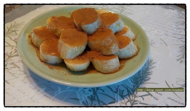 잘 썰어 놓은 바나나를 보기 좋게 접시에 담아주세요. 이제 달콤한 꿀과 향긋한 계피가루를 뿌릴 준비를 합니다.