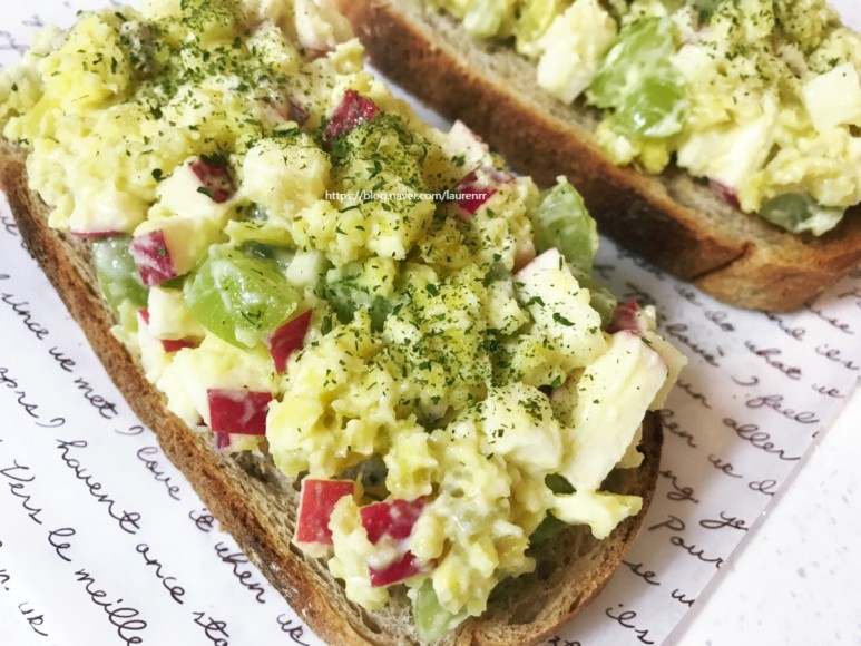 사과는 씨 부분을 제거하고, 껍질째 또는 껍질을 벗겨내어 1cm 정도 크기로 잘게 썰어 으깬 고구마 위에 넣어주세요. 아삭한 식감이 토스트와 잘 어울릴 거예요.