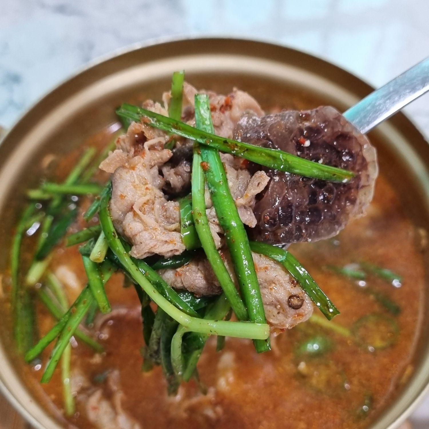 -마무리: 마지막으로 준비한 부추와 송송 썬 청양고추를 듬뿍 올린 후, 불을 꺼주세요. 뜨끈한 김이 올라오는 대패 오리 순대국밥 완성!