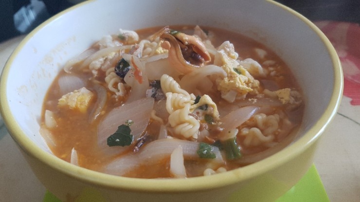 이렇게 완성된 해물라면은 면과 함께 홍합을 계란 노른자에 살짝 찍어 먹으면 더욱 부드럽고 풍부한 맛을 느낄 수 있습니다. 별거 아닌 것 같지만, 재료 본연의 맛과 조화로운 라면의 맛이 일품입니다.