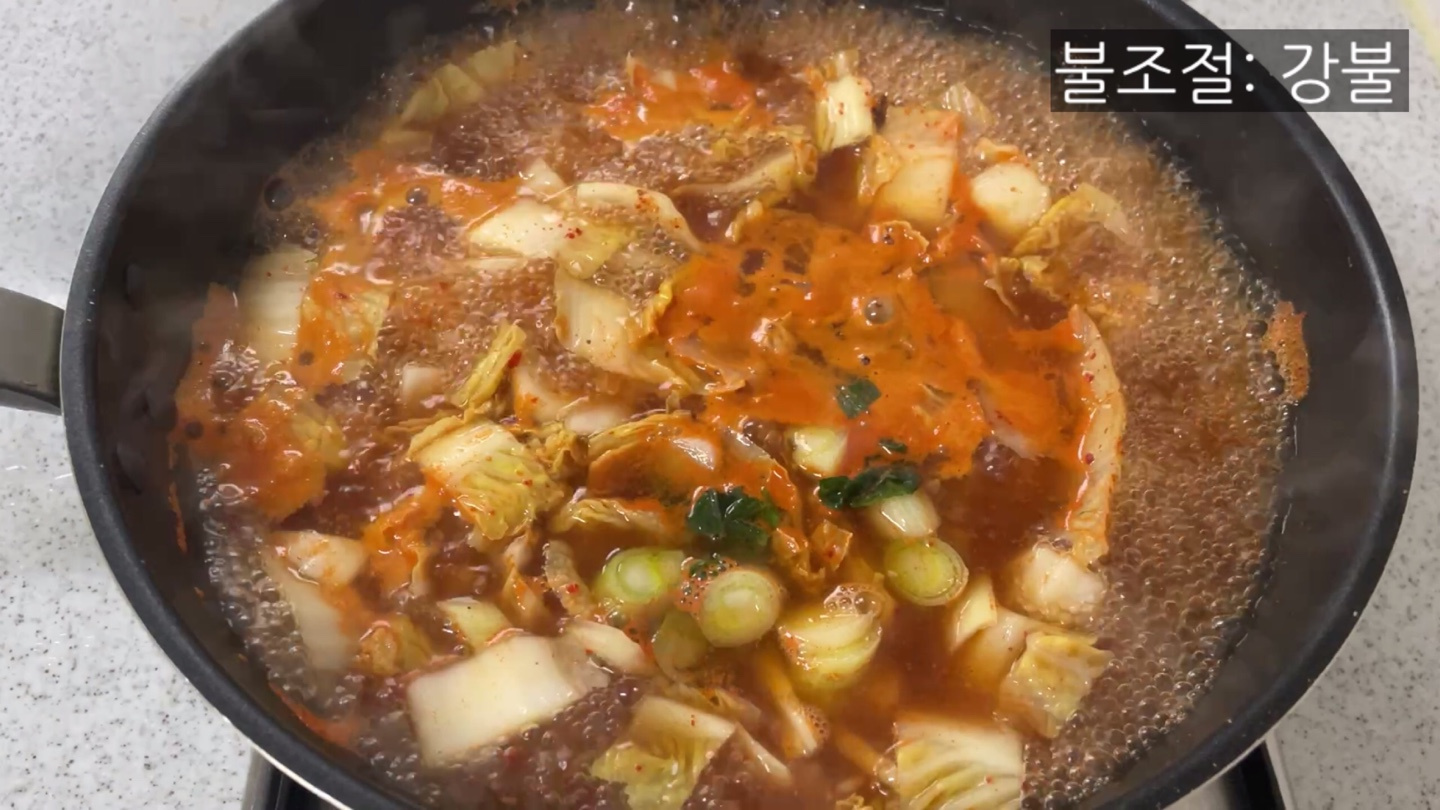 배추가 어느 정도 익으면 불을 약불로 줄이고, 다진 마늘 1/2 작은술, 다시다(또는 감칠맛을 더해줄 조미료) 1/2 작은술, 고춧가루 2/3 작은술, 국간장 1 작은술을 순서대로 넣어줍니다. 국간장은 간을 보면서 조절하시면 좋습니다.