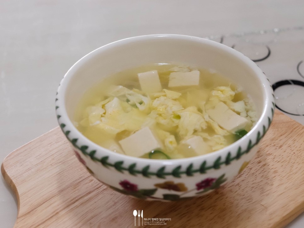 마지막으로 먹기 좋은 크기로 깍둑썰기한 두부 1/2모와 송송 썰어 준비한 대파를 넣습니다. 두부가 익을 때까지 1~2분 정도 더 끓여주세요. 국간장만으로 간을 맞추면 국물 색깔이 다소 탁해질 수 있으니, 나머지 간은 소금을 이용해 입맛에 맞게 조절하는 것이 좋습니다. 맑고 개운한 계란국을 맛보세요!