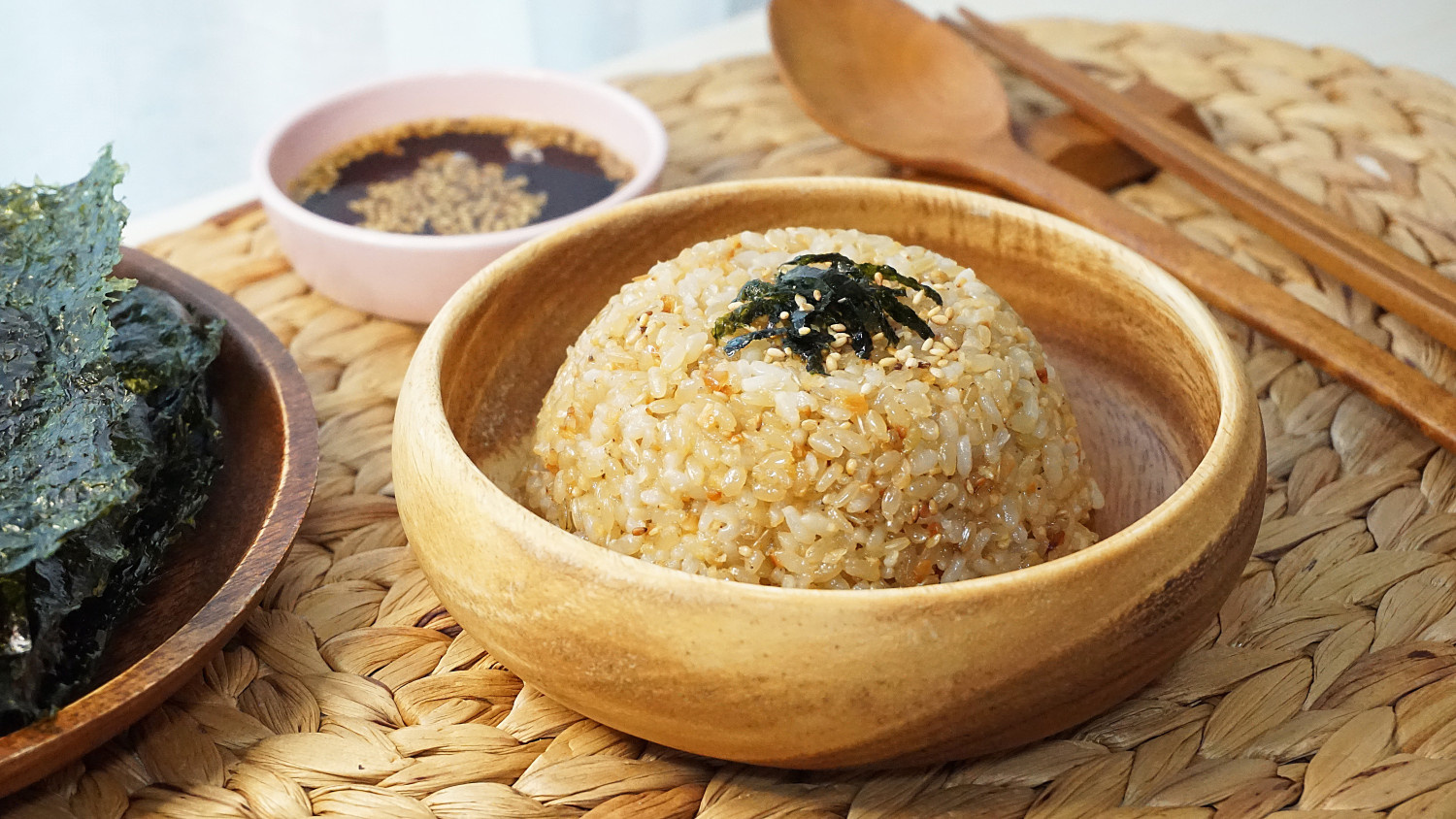 함께 곁들여 먹을 김을 바삭하게 구워주세요. 이 볶음밥과 구운 김의 조합은 정말 환상적이랍니다! 김의 바삭함과 밥의 고소함이 어우러져요.