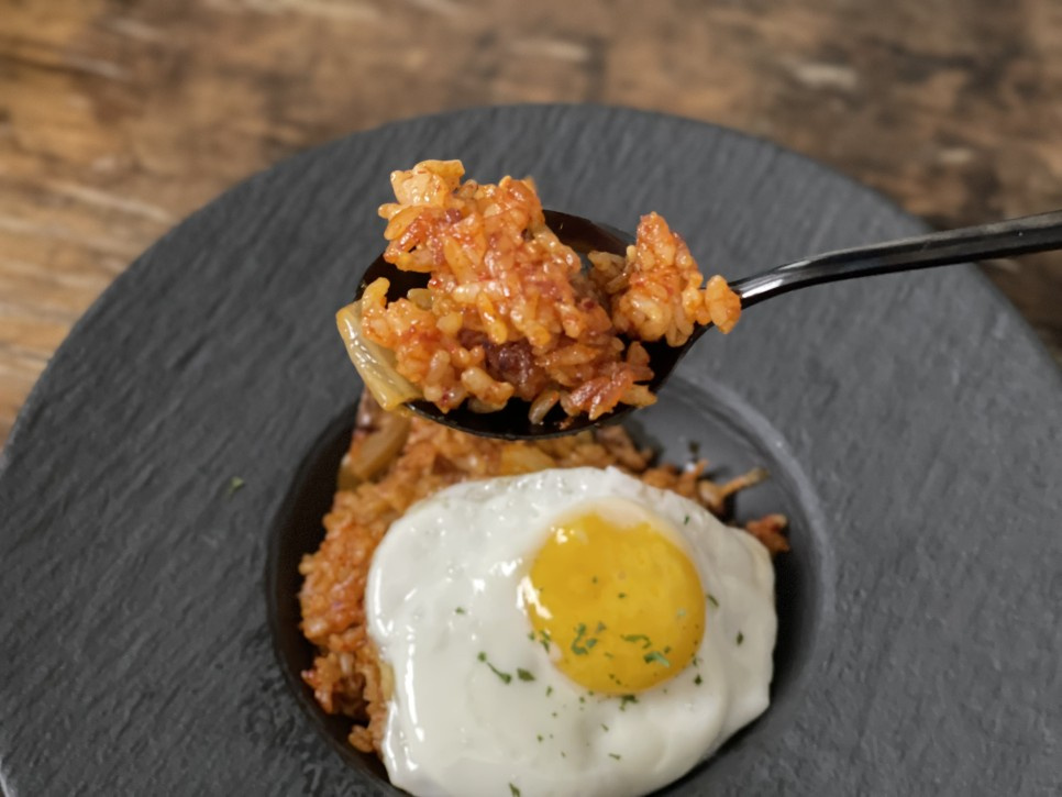 마지막으로, 김치볶음밥 위에 노릇하게 구운 계란 프라이를 얹어주면 완성입니다! 반숙 노른자를 톡 터뜨려 밥과 함께 비벼 먹으면 그 맛은 두말할 필요가 없죠. 맛있게 즐기세요!