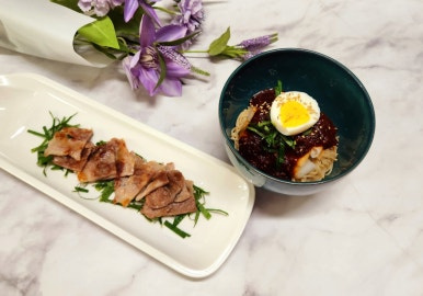 후텁지근한 여름, 입맛 없을 때 최고의 선택! 매콤달콤한 류수영 비빔냉면으로 잃어버린 입맛을 되찾아보세요. 든든한 한 끼 식사로도 손색없답니다. 비빔냉면에는 역시 고기가 빠질 수 없죠! 부드러운 목살구이와 삶은 계란까지 곁들여 단백질까지 완벽하게 보충하는 푸짐한 여름 별미를 즐겨보세요. ♡