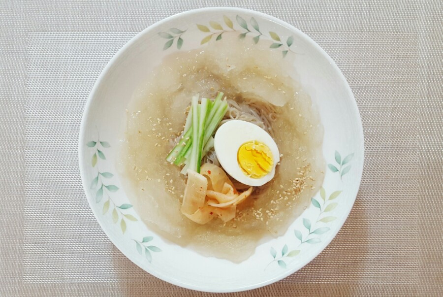 얼린 육수를 사용하실 경우, 칼로 살얼음이 생기도록 툭툭 쳐서 부숴주세요. 이렇게 하면 살얼음 동동 뜬 시원한 육수를 만들 수 있어 냉면 맛이 배가 됩니다.