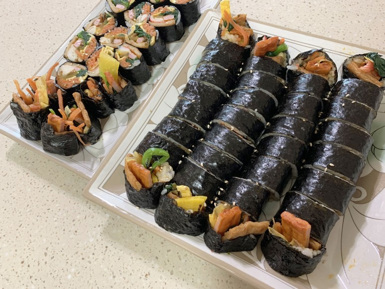 밥 없는 김말이와 밥을 넣고 정성껏 만든 집김밥이 모두 완성되었습니다! 단면이 보이도록 완성 접시에 올린 것이 밥 없는 김말이이고, 김밥집처럼 가지런히 쌓아 올린 것이 밥이 있는 집김밥입니다. 남은 김말이는 달걀물을 입혀 노릇하게 부쳐 드셔도 정말 맛있답니다. ^^