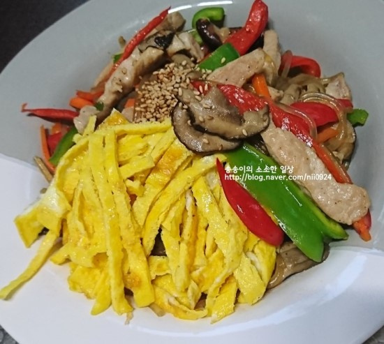 준비한 고기, 색색의 파프리카, 그리고 계란 지단으로 예쁘게 장식하면, 마치 전문점에서 만든 듯한 근사한 잡채가 완성됩니다.