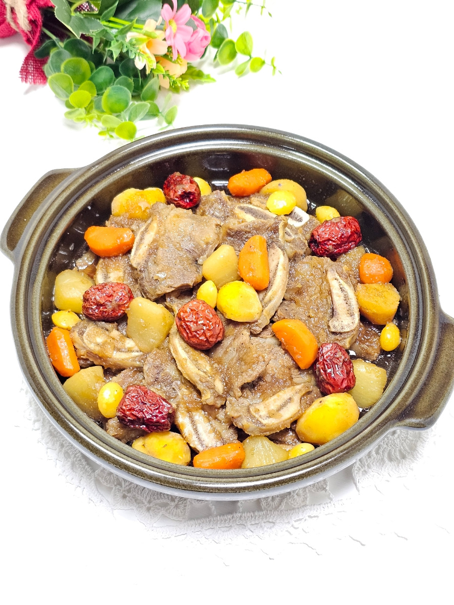 갈비가 부드럽게 익어가는 동안, 다른 냄비에 남은 양념장 2컵과 물 1컵을 넣고 끓입니다. 국물이 끓기 시작하면 준비한 무와 당근, 밤, 은행을 넣고 채소가 익을 때까지 끓여주세요. 이때 냄비 위에 뜨는 거품은 말끔하게 걷어내어 국물을 맑게 유지합니다.