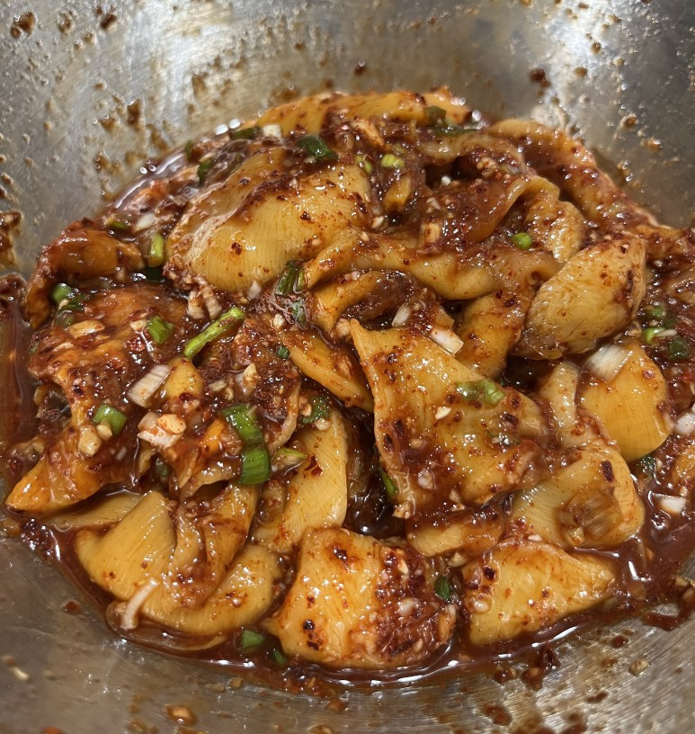 미리 만들어 둔 매콤달콤한 멍게 무침 양념을 멍게 위에 붓고, 멍게가 부서지지 않도록 조심스럽게 조물조물 무쳐줍니다.