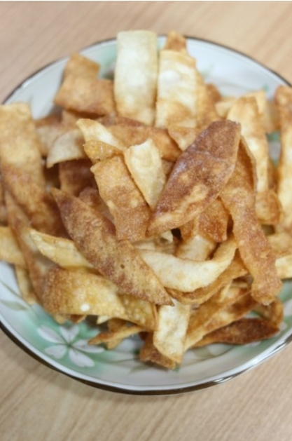 잘 튀겨진 만두피는 이렇게 먹음직스러운 황금빛을 띠며 매우 바삭해 보입니다. 이대로 튀긴 만두피를 소금만 살짝 뿌려 먹어도 담백하고 고소한 맛이 일품이에요. 기본적인 과자처럼 즐기기에도 충분하답니다.