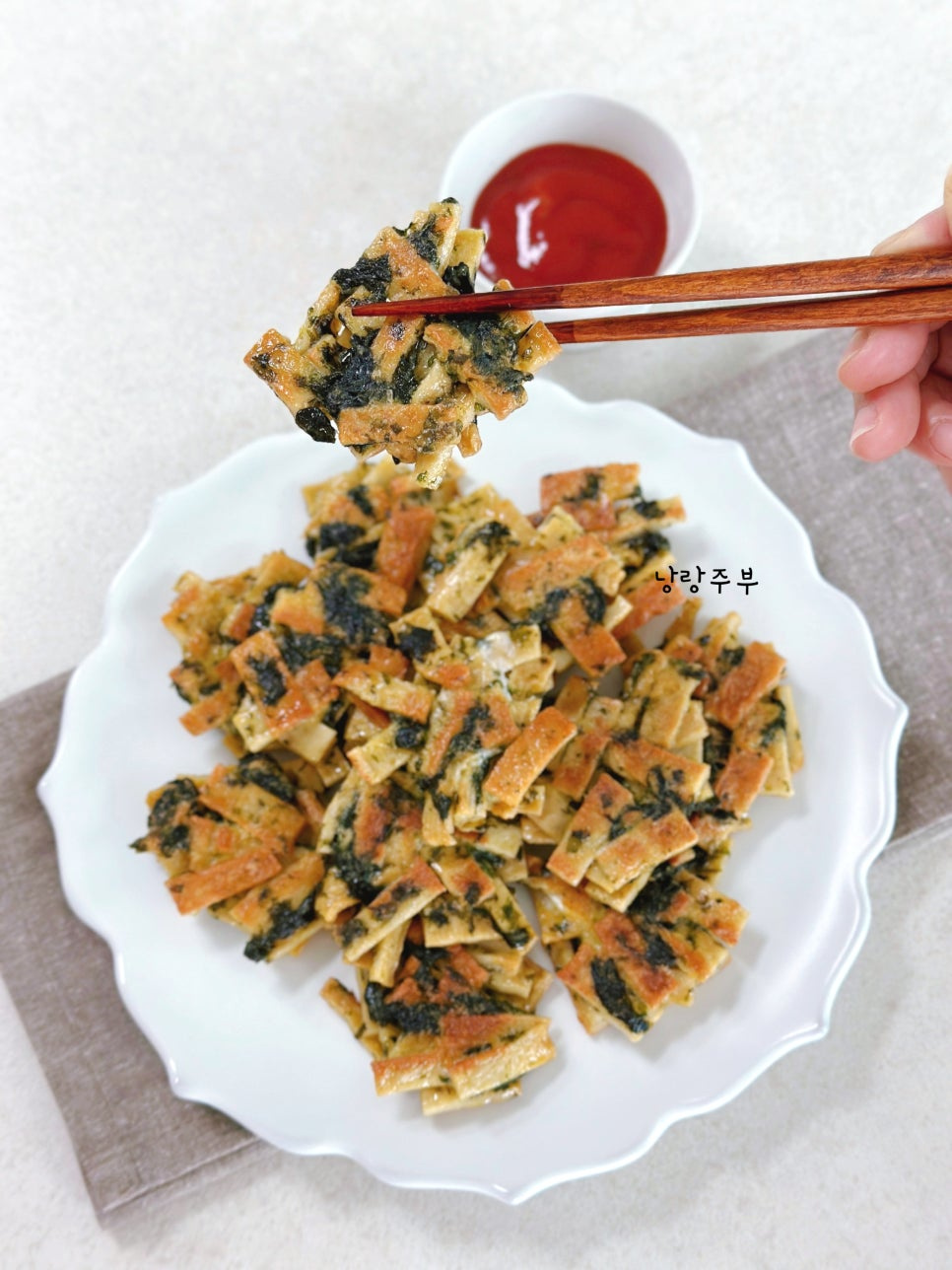 이번 레시피에서는 양념이 되지 않은 구운 곱창김을 사용했습니다. 김은 반죽에 넣으면 자연스럽게 풀리지만, 뭉치지 않고 골고루 섞이도록 미리 적당한 크기로 잘라두는 것이 좋습니다. 살짝 눅눅해진 김을 활용해도 아주 맛있습니다.