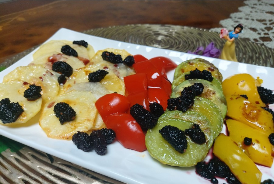 잘 구워진 채소 구이를 접시에 보기 좋게 담아냅니다. 취향에 따라 간장, 발사믹 드레싱 등의 소스를 곁들여 먹거나, 그대로 즐겨도 담백하고 맛있습니다. 직접 만든 오디청을 살짝 얹어주면 상큼한 맛이 더해져 훌륭한 아침 샐러드 겸 식사로도 손색이 없습니다.