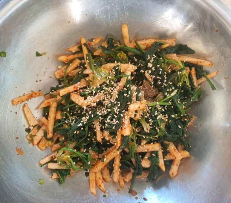 마지막으로 고소한 참기름을 살짝 두르고 통깨를 솔솔 뿌려 가볍게 한 번 더 버무려주세요. 향긋한 참기름과 고소한 깨가 더해져 완성도를 높여줍니다. 맛있는 섬초배 무침을 따뜻한 밥상에 곁들여 즐겨보세요!