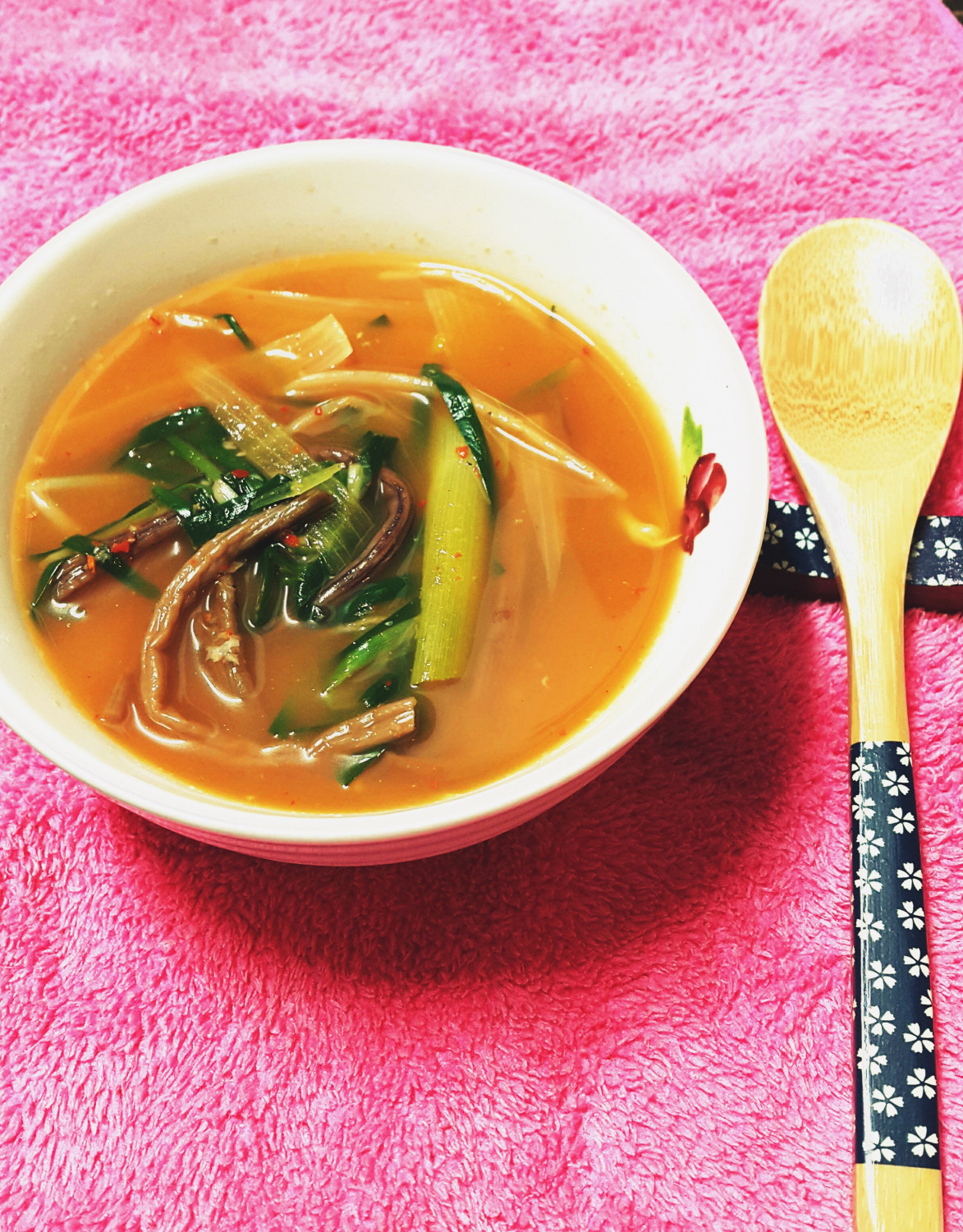 국물 맛을 풍부하게 해줄 채소들을 준비합니다. 고사리, 시래기, 단배추는 미리 삶아서 준비해주세요. 숙주나물도 살짝 데쳐서 준비합니다. 부추는 깨끗하게 씻어 준비해주세요. 모든 채소는 약 5cm 길이로 먹기 좋게 썰어둡니다. (Tip: 시래기와 고사리는 부드러워질 때까지 충분히 삶아야 국물에 쓴맛이 나지 않고 부드럽습니다.)