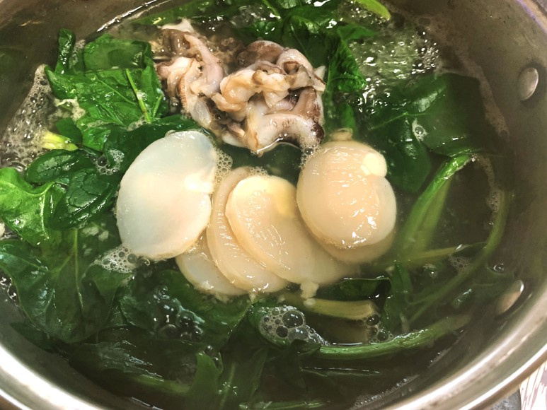 이제 모든 재료를 테이블에 세팅합니다. 갓 무친 신선한 시금치, 쫄깃한 키조개 관자, 그리고 톡 터지는 새조개를 보기 좋게 담아냅니다. 육수가 끓으면 바로 드실 준비를 합니다.