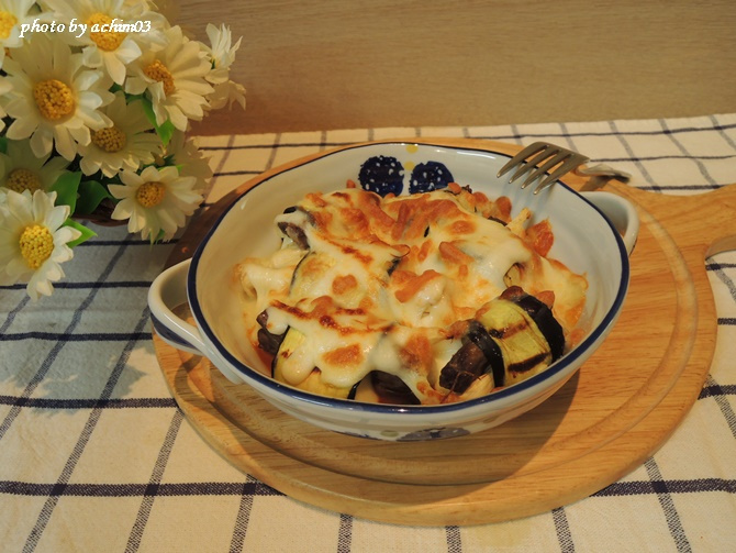 에어프라이어에 190도로 예열한 후, 가지롤을 넣고 7분간 구워줍니다. 노릇하게 구워진 치즈와 부드러운 가지, 쫄깃한 우둔살의 환상적인 조화를 즐겨보세요. 맛있는 가지롤 완성입니다!