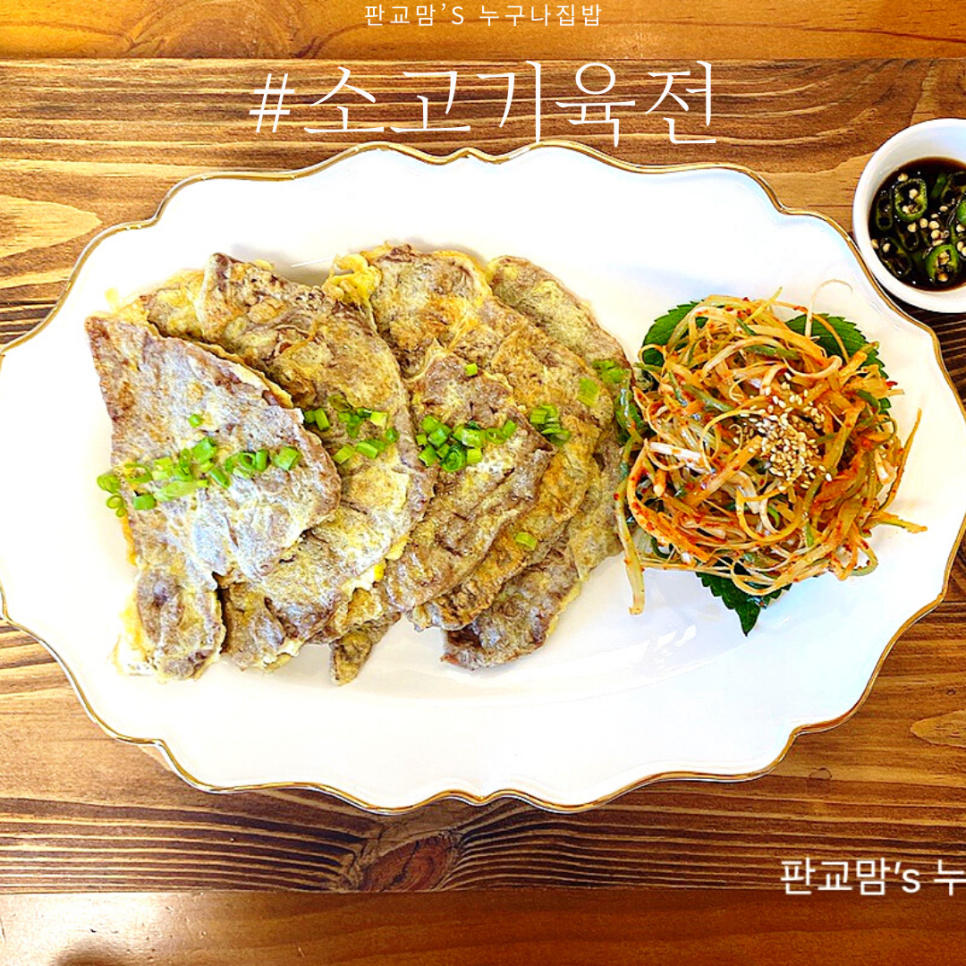 신랑분은 물론 아이들 입맛까지 사로잡아, 한 번 만들면 순식간에 사라지는 저희 집 밥상의 인기 메뉴! 특별한 날은 물론, 평소에도 근사한 한 끼를 책임져 줄 소고기 육전과 상큼한 파채무침을 소개합니다. 겉은 바삭하고 속은 촉촉한 육전과 아삭하게 씹히는 파채의 조화가 일품이랍니다.