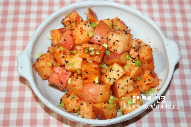 준비된 썰어놓은 과일과 채소에 양념 재료(소금, 고춧가루, 송송 썬 쪽파)를 넣고 골고루 버무려줍니다. 마지막으로 통깨를 뿌려 마무리하면, 새콤달콤하고 아삭한 식감의 맛있는 과일 깍두기가 완성됩니다! 바로 드셔도 좋고, 냉장 보관하며 차갑게 드시면 더욱 맛있습니다.