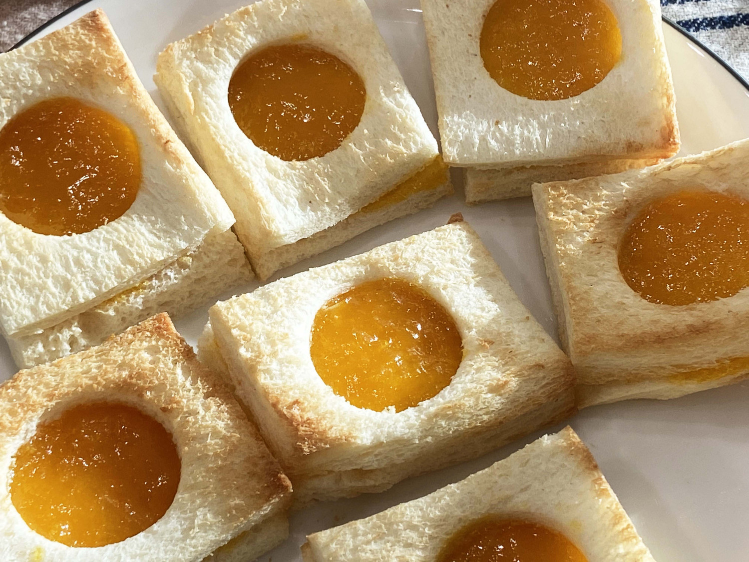 나머지 8조각의 식빵에는 방금 만들어 둔 따뜻하고 맛있는 귤잼을 듬뿍 발라주세요. 잼을 바른 식빵 위에, 가운데가 눌린 식빵 조각을 덮어 샌드위치처럼 만들어 주면 됩니다. 꼼꼼하게 덮어주세요.