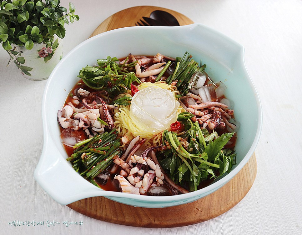 물회 그릇에 담기: 커다란 물회 그릇에 삶아 차갑게 준비한 소면을 먼저 담아줍니다. 그 위에 준비한 미나리, 쪽파, 그리고 오징어 숙회를 보기 좋게 올려주세요.