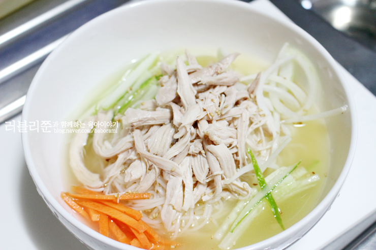 이제 모든 재료를 보기 좋게 담아낼 차례입니다. 면기 위에 준비해둔 찢은 닭고기, 채 썬 오이, 당근, 양파를 보기 좋게 빙 둘러서 보기 좋게 올려줍니다. 마지막으로, 미리 양념해둔 차갑고 살얼음 동동 뜬 육수를 면과 고명 위로 자작하게 부어주면, 입맛 없을 때 최고의 선택인 시원하고 맛있는 초계국수가 완성됩니다! 맛있게 드세요!