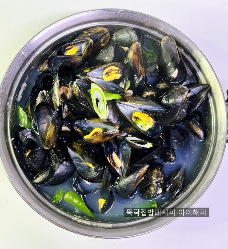 홍합이 익으면서 입을 벌리고 부피가 커져 넘칠 수 있으니, 넉넉한 크기의 냄비를 사용하는 것이 좋습니다. 만약 낮은 냄비를 사용하신다면, 물을 70~80% 정도만 채워서 끓여주세요. 안전하게 조리하는 것이 중요해요!