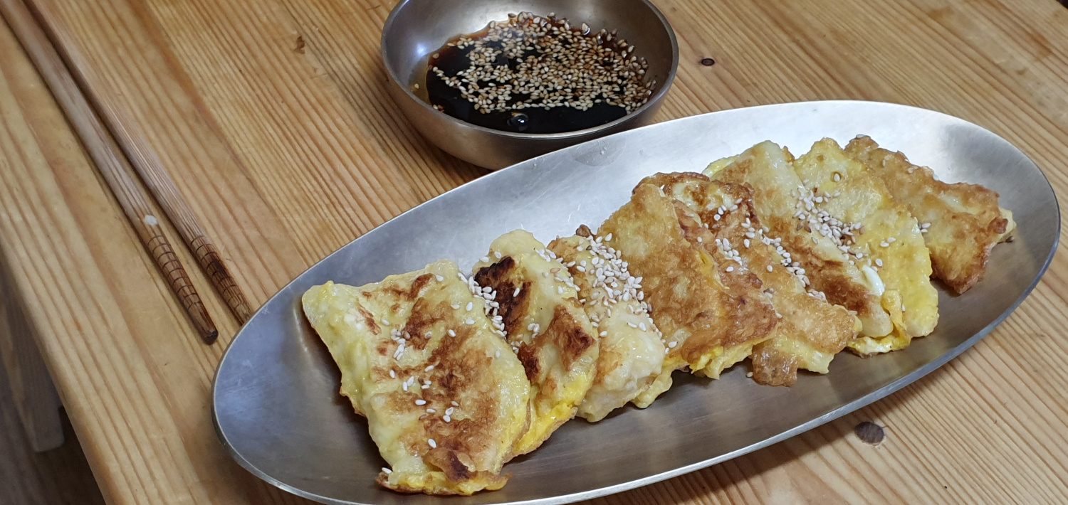이제 팬을 중간 불로 달구고 식용유를 넉넉하게 둘러주세요. 팬이 충분히 달궈지면, 부침가루 옷을 입힌 죽순을 가지런히 올립니다. 그 위에 풀어둔 계란물을 한국자 떠서 죽순이 잠기도록 부어줍니다. 계란물이 익기 시작하면 앞뒤로 뒤집어가며 노릇노릇하게 구워주세요. 타지 않도록 불 조절에 신경 써주시는 것이 좋습니다.