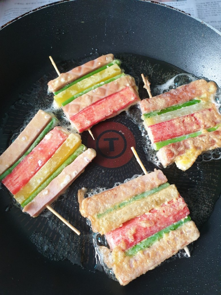 중약불로 달군 팬에 식용유를 넉넉히 두르고 꼬치전을 앞뒤로 노릇하게 구워줍니다. 한 면이 노릇하게 익기 시작하면 뒤집어서 다른 면도 똑같이 익혀주세요. 꼬치의 재료들이 모두 익었는지, 그리고 부침가루와 계란물이 노릇하게 익었는지 확인하면서 구워주시면 됩니다. 너무 센 불에 구우면 겉만 타고 속은 익지 않을 수 있으니 불 조절에 유의해주세요.