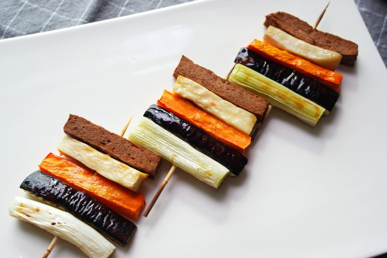 이제 꼬치에 꽂을 준비를 합니다. 콩고기 패티를 제외한 준비된 채소 (당근, 대파, 새송이버섯, 가지)에 소금을 아주 소량 (2꼬집 정도) 뿌려 가볍게 밑간을 해주세요. 채소의 단맛을 더욱 살려주고 간을 맞춰주는 과정입니다.