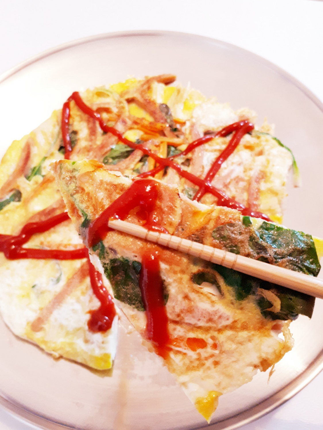 마지막으로 토마토케첩을 지그재그로 뿌리거나, 원하시는 모양으로 그려 장식해주시면 더욱 보기 좋은 팽이버섯 시금치 달걀전이 완성됩니다. (모양이 조금 찌그러져도 귀여워요!)