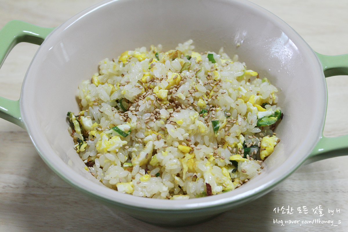 자, 이제 준비한 스크램블 에그를 젓가락이나 주걱으로 잘게 부숴주세요. 이렇게 섞으면서 재빨리 볶아주시면 됩니다! 밥알이 뭉치지 않도록 계속 저어주면서 파, 계란과 잘 섞이도록 볶아주세요. 간은 소금을 톡톡 뿌려 맞춰주시면 되는데, 취향에 따라 굴소스나 간장을 살짝 추가해도 맛있어요. 너무 많이 넣지 않도록 주의하세요.