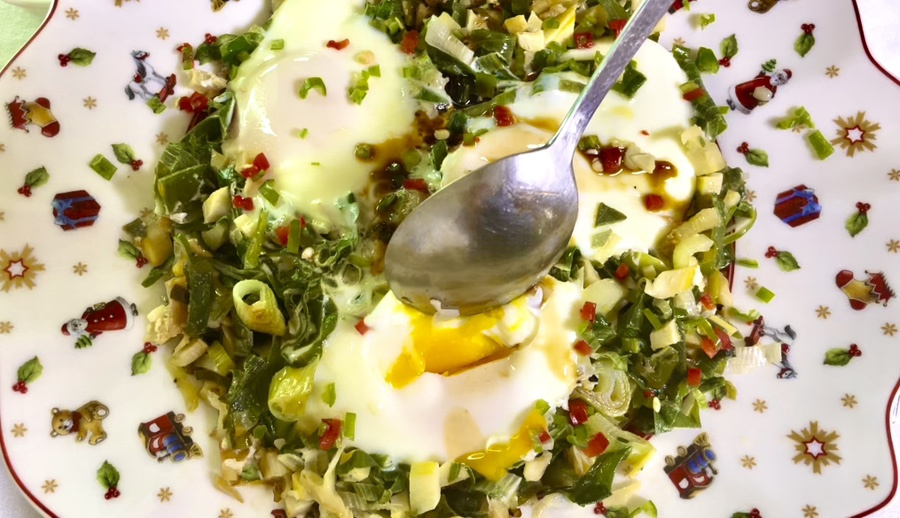 잘 볶아진 대파와 죽순 위에 달걀 3개를 깨뜨려 넣습니다. 흰자가 반 정도 익기 시작할 때까지만 살짝 익혀주세요. 노른자는 터뜨리지 않고 그대로 두면 더욱 먹음직스럽습니다.