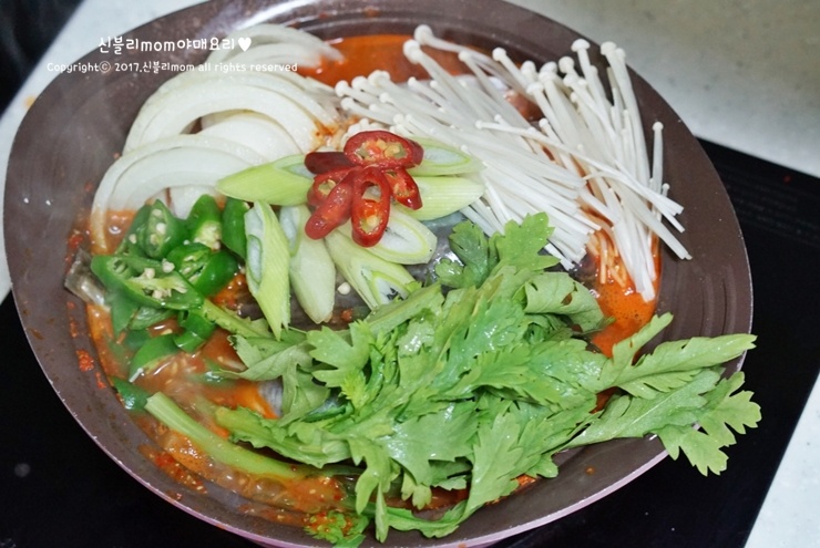 도루묵을 넣은 후, 그 위에 준비해둔 채소(양파, 대파, 고추)를 보기 좋게 올려줍니다. 사진처럼 냄비가 재료로 가득 차 넘치기 직전이라면, 재료 본연의 맛을 즐기기에 충분한 양이랍니다! 도루묵의 크기가 크고 양이 많을 때는 넉넉한 냄비를 사용하는 것이 좋겠죠?